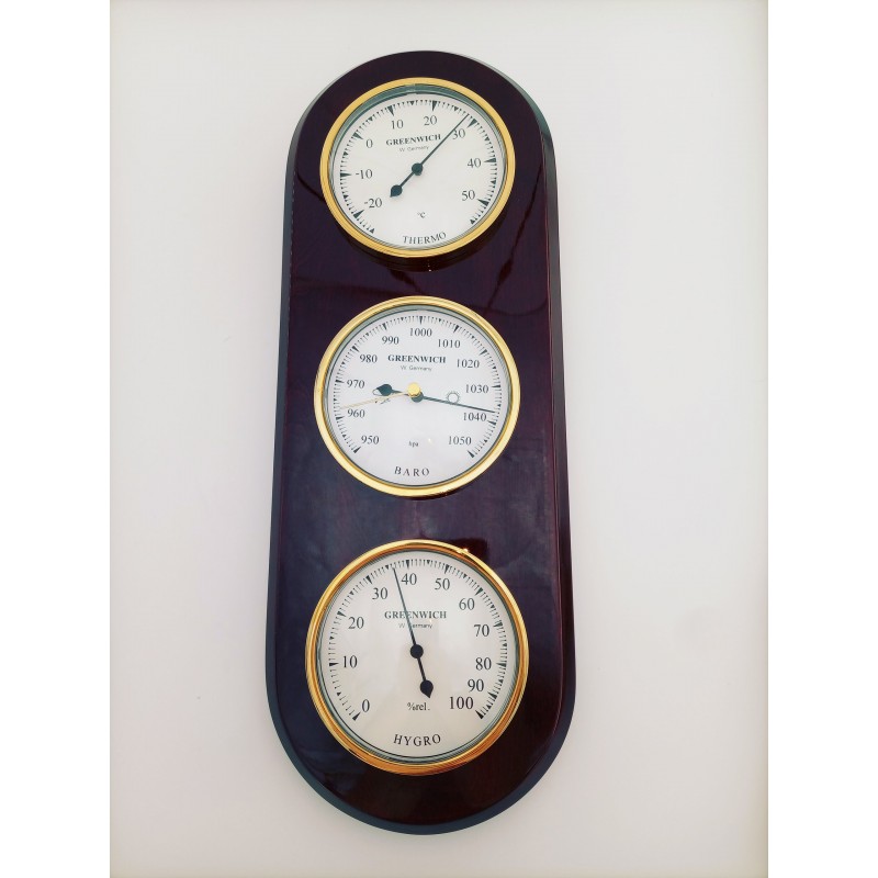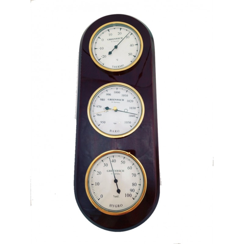 Σύνθεση οργάνων από Βαρόμετρο-Υγρόμετρο -θερμόμετρο τοίχου, τοποθετημένα σε ξύλινη βάση από ξύλο καρυδιάς σε οβάλ σχήμα.