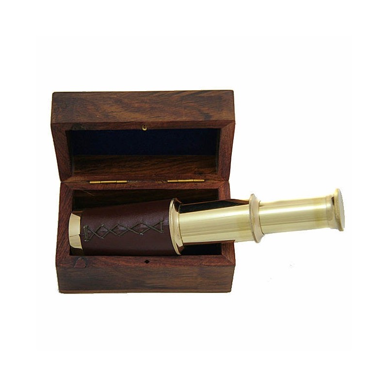 Τηλεσκόπιο από μπρούτζο με εξωτερική επένδυση δέρμα σε ξύλινο κουτί.