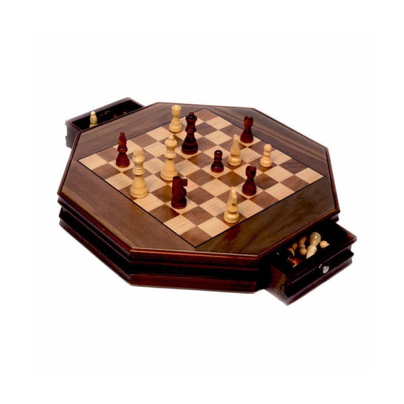 Σκακιέρα, Σκάκι από καρυδιά μαρκετερί χειροποίητη, με ξύλινα πιόνια. Εχει οκτάγωνο σχήμα και δύο συρτάρια για να τοποθετούνται τα πιόνια.